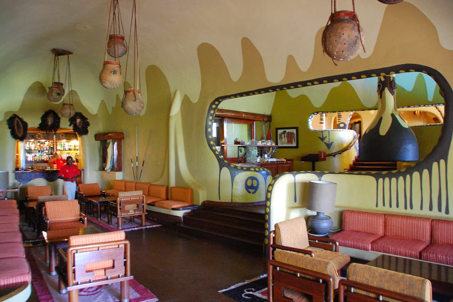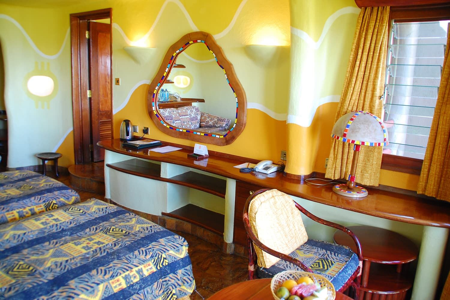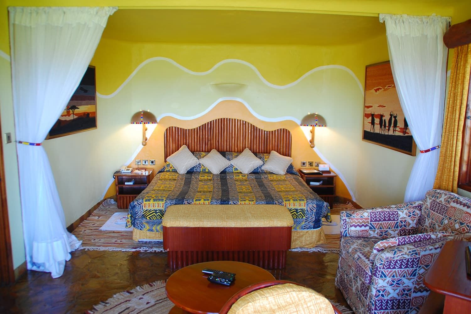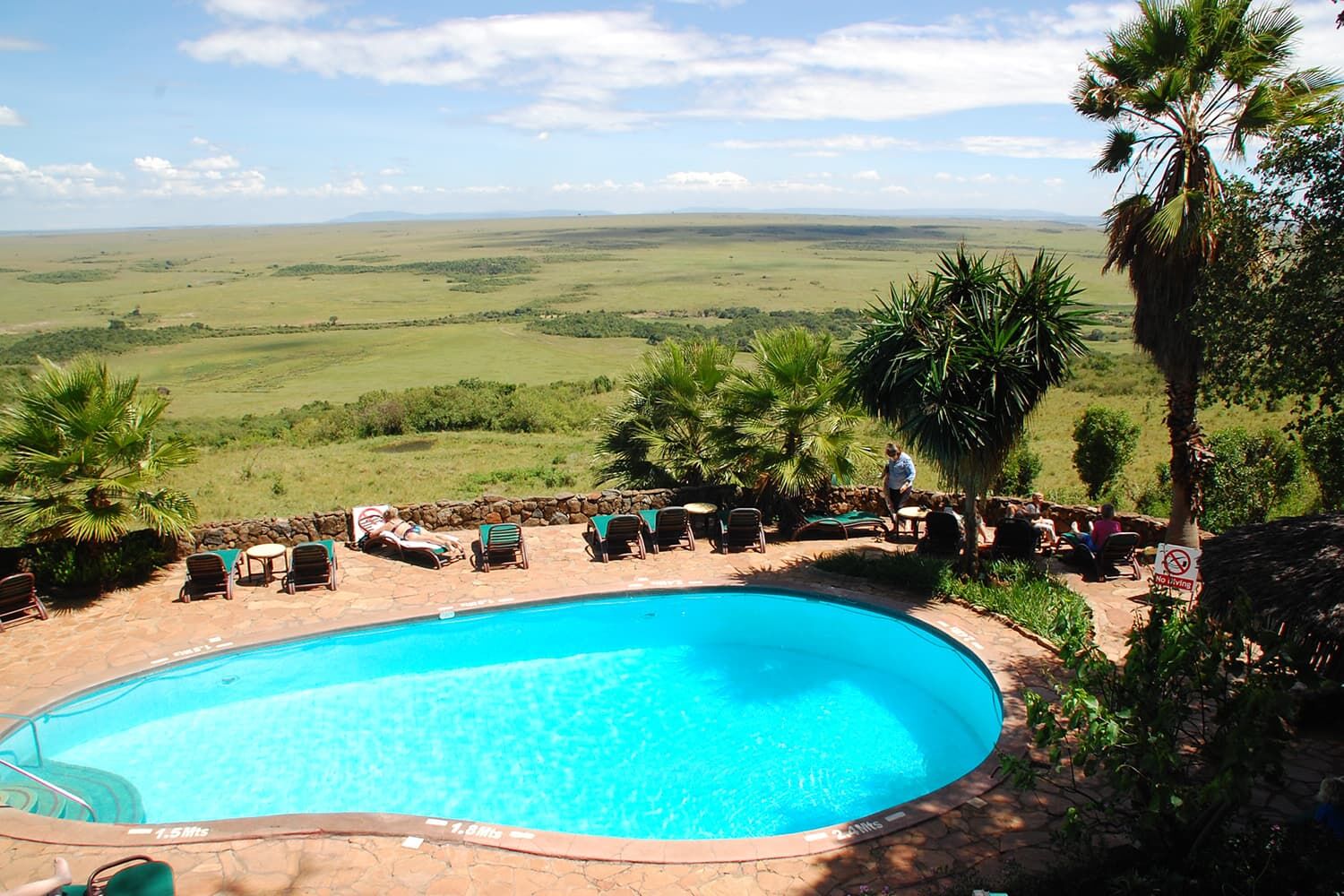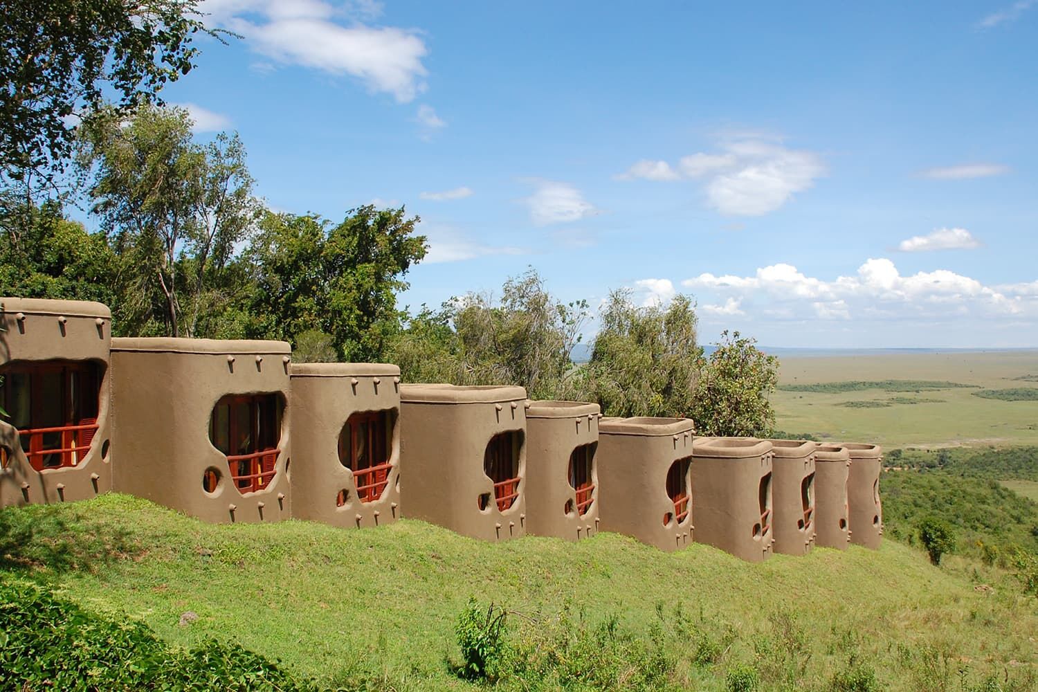 マラ川を見下ろす丘の斜面に建つロッジ。レセプションから遠い部屋は下にあるのでちょっとした運動になる。レストランや部屋はマサイの家を模した構造となり、カラフルで丸みを帯びてかわいらしいデザインとなっている。8月や9月はヌーの川渡りに近いため混む。
