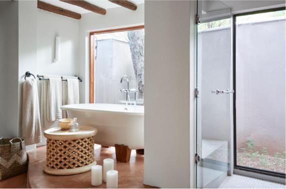 バスタブ、室内と室外シャワー、ミニバー、シーリングファン(天井にぶらさがる扇風機)、エアコン、蚊帳