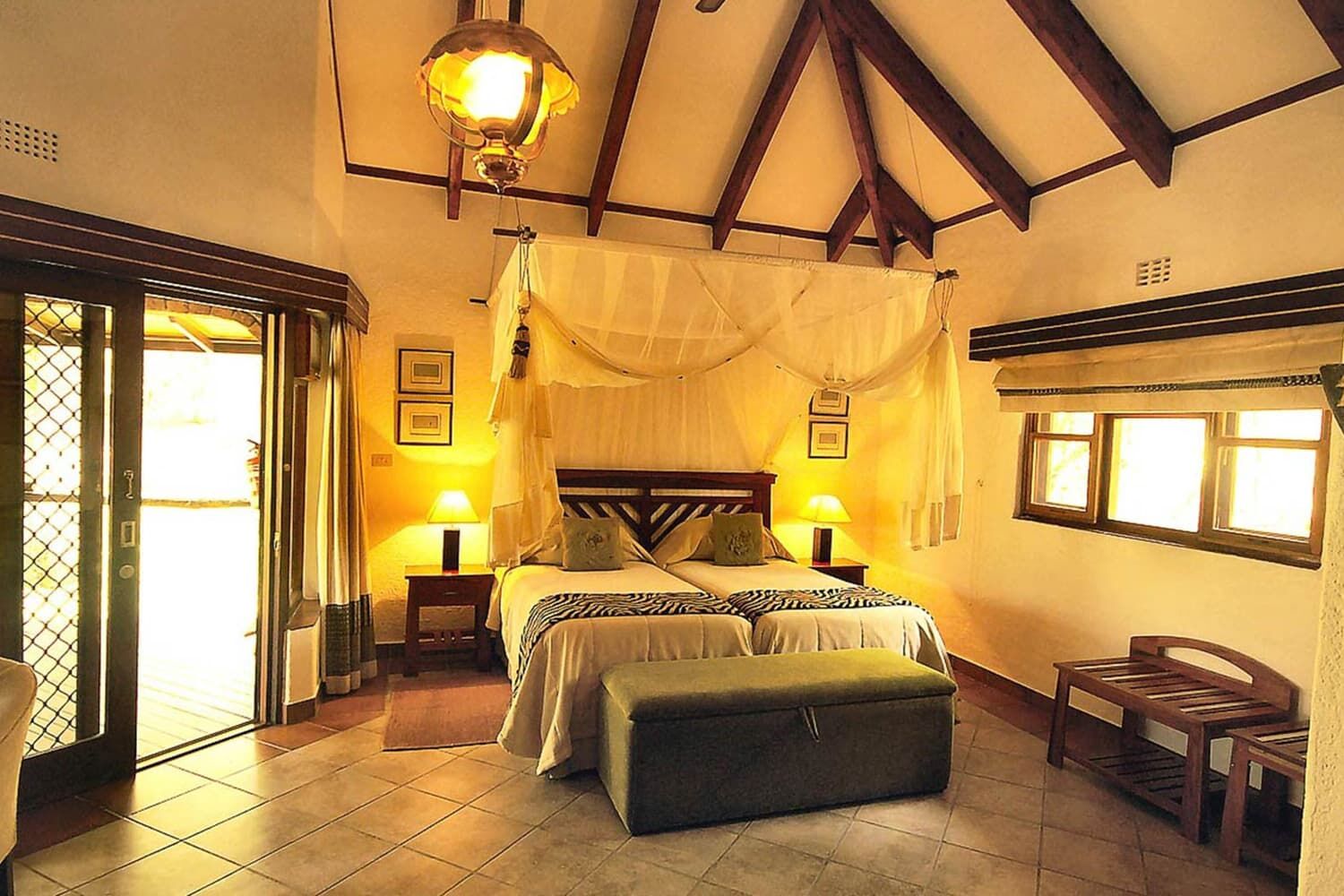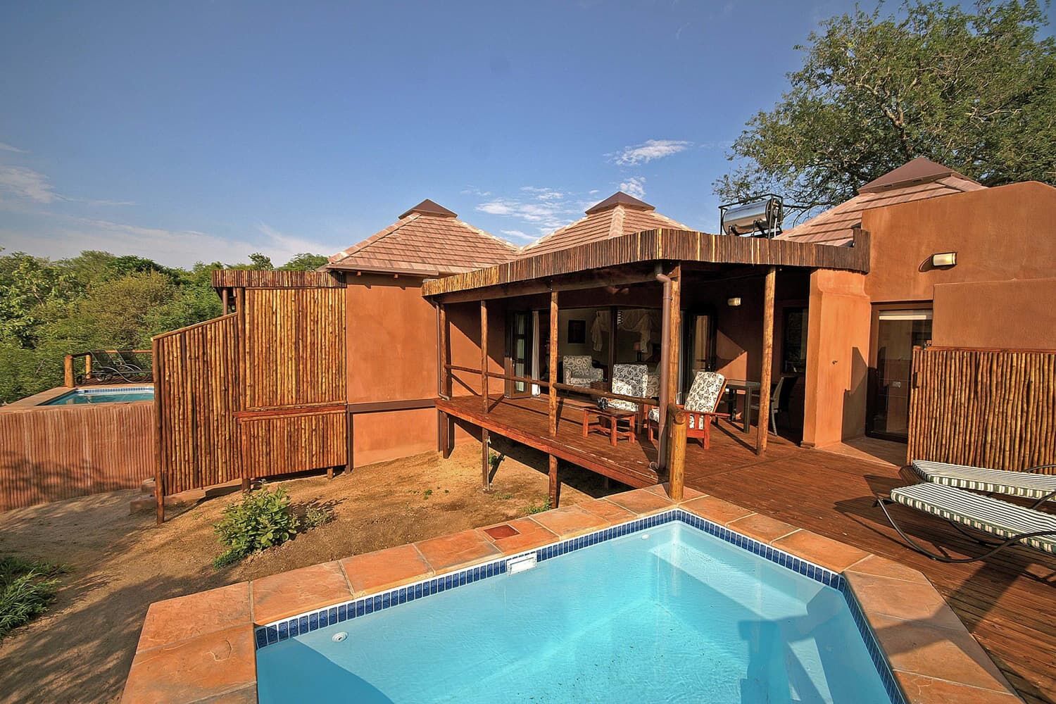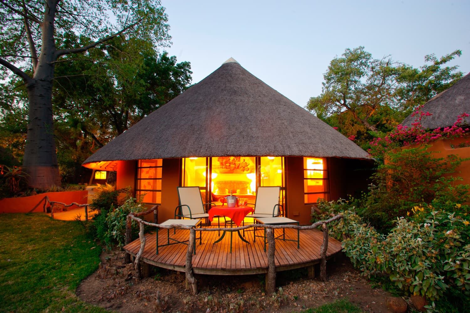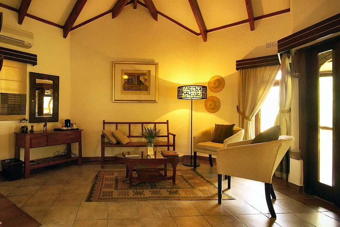 サビ・サンズ地区の中では宿泊料金が比較的リーズナブル。 各部屋(シャレー)には展望バルコニー(ベランダ)も付いているので、昼間はのんびりとそこで寛ぐのも良い。 ロッジの敷地内には、イボイノシシやニャラなどが遊びにくることもある。