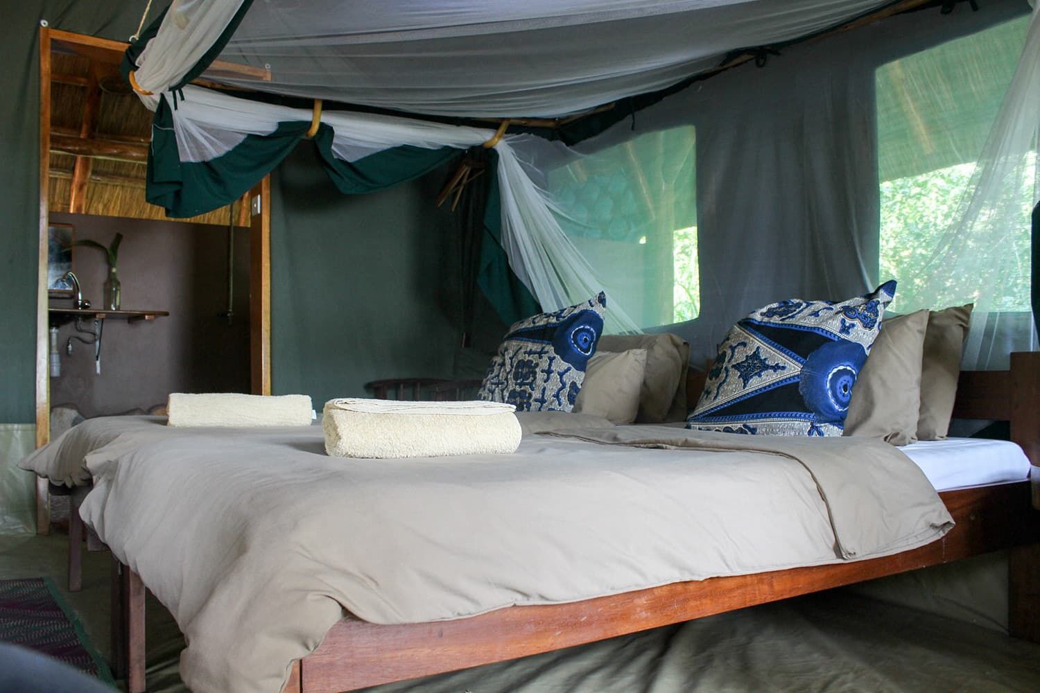 ロッジ式とテント式、シャワー、蚊帳