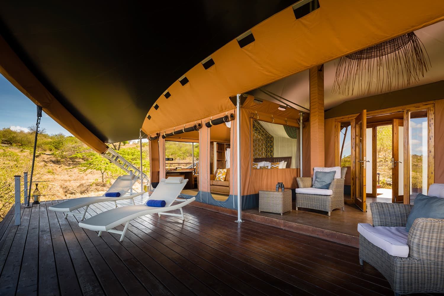 ラグジュアリーテント、各テントにバスタブ有、オープンデッキ有