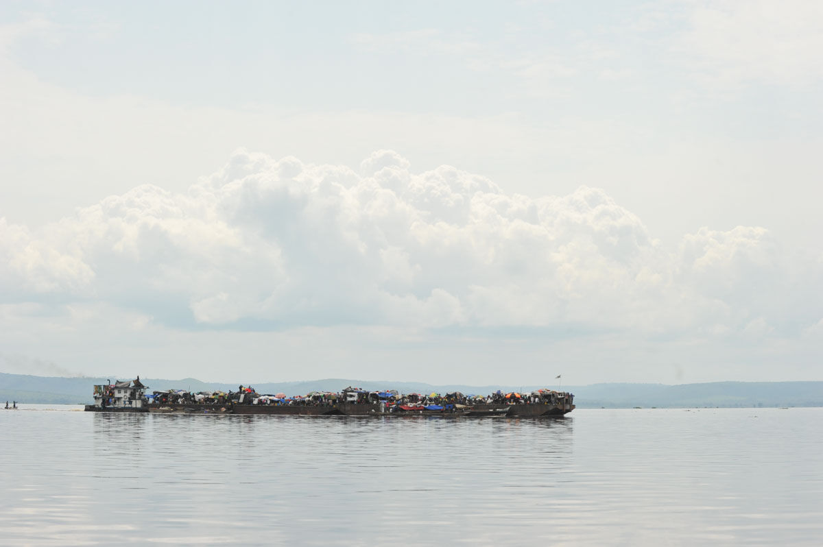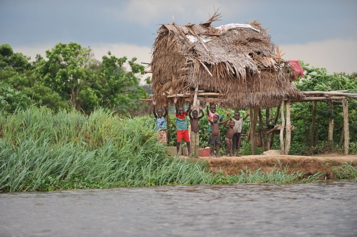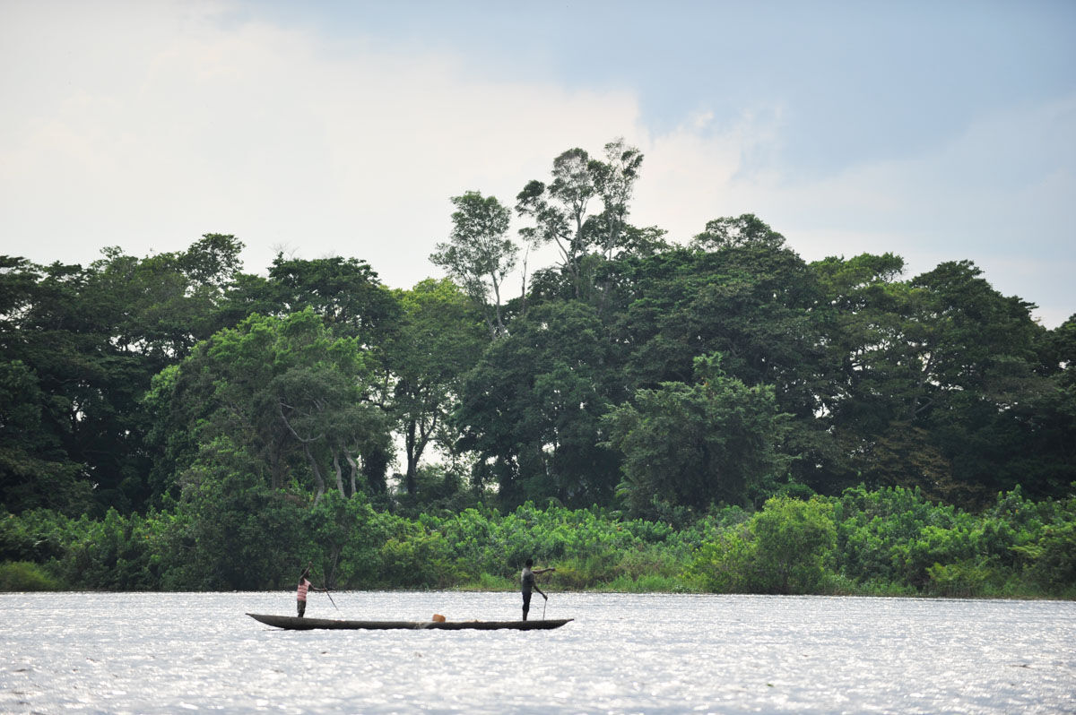 朝食後、ボートに乗り換え、大河コンゴ川を遡ります。その後、支流へと入り、オヨへ。