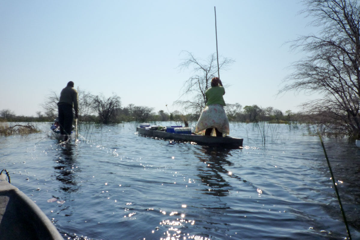 2泊3日分の個人荷物とキャンプ用具をお出迎えの別トラックに積み込み出発。デルタの船着き場にて荷物とともにモコロ(伝統的丸木舟)に乗り換え、船頭さんたちとともにオカバンゴ・デルタの島へ。到着後、テント設営。