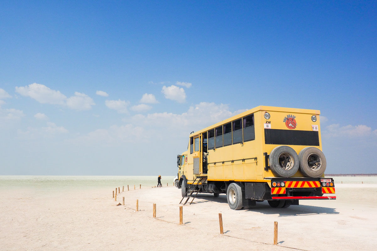 朝食後、ウィントフックを出発。北部に位置するナミビアを代表するエトーシャ国立公園へ。到着、テント設営後、公園内をトラックにてサファリ。エトーシャはメインロード以外に道がありませんので、視点の高いトラックからの方がより野生動物が見やすくなっています。