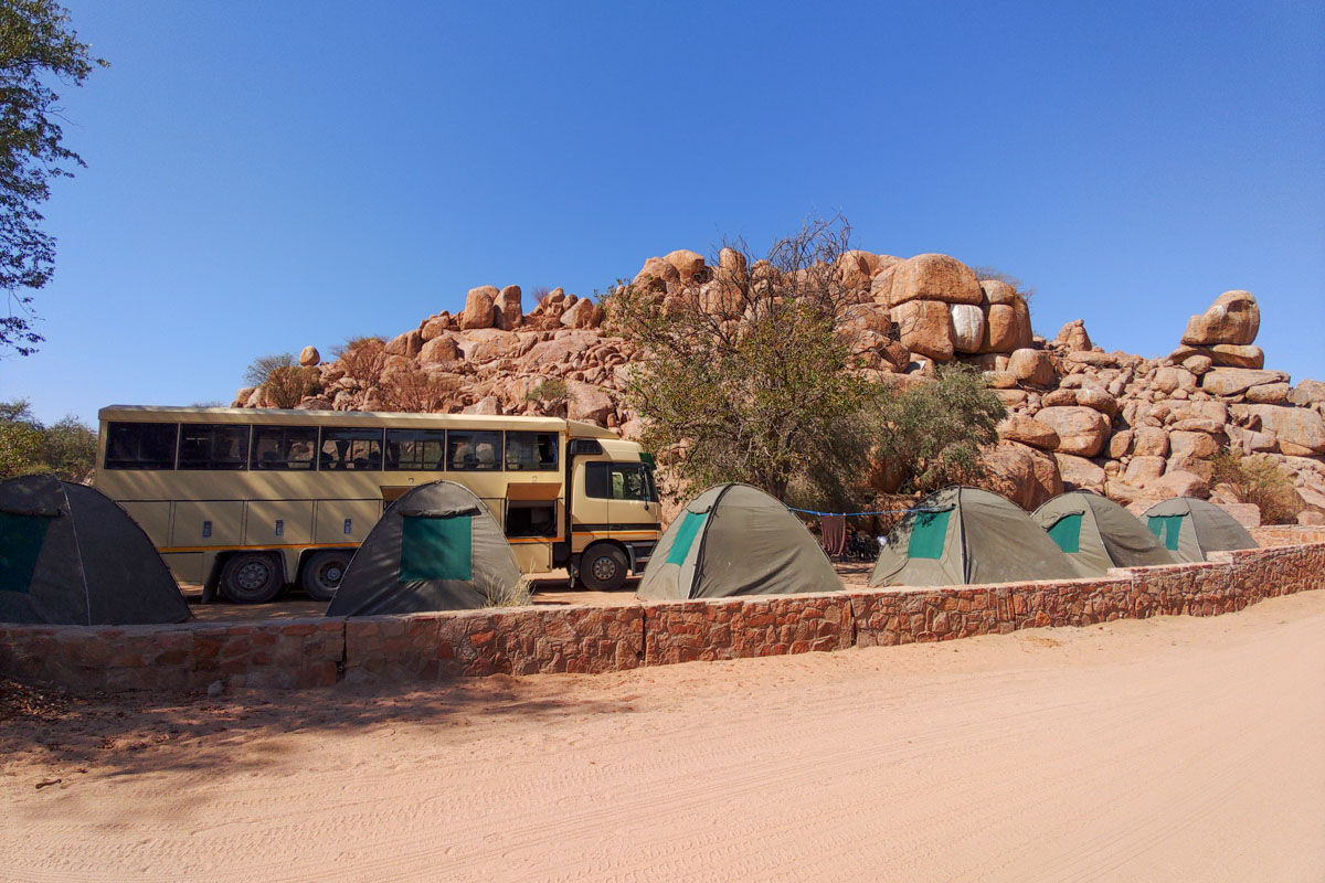 朝食後、キャンプを撤収。特徴的な岩山と荒涼とした大地からなる、ナミビア中央部ダマラランドへ。途中、ヒンバの人たちの村を訪問し暮らしぶりを見学。午後、サンの人々によって刻まれた岩画がご覧いただける、世界遺産のトゥウェイフルフォンテーンを見学後、キャンプへ。