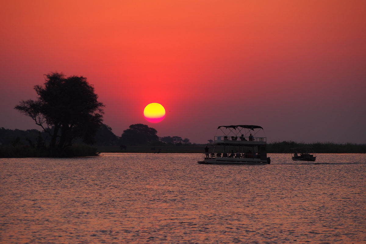 ジンバブエを出国し、ボツワナ入国。テント設営後、午後から日没にかけて、チョベ川でのサファリを兼ねたサンセット・クルーズをお楽しみいただきます。